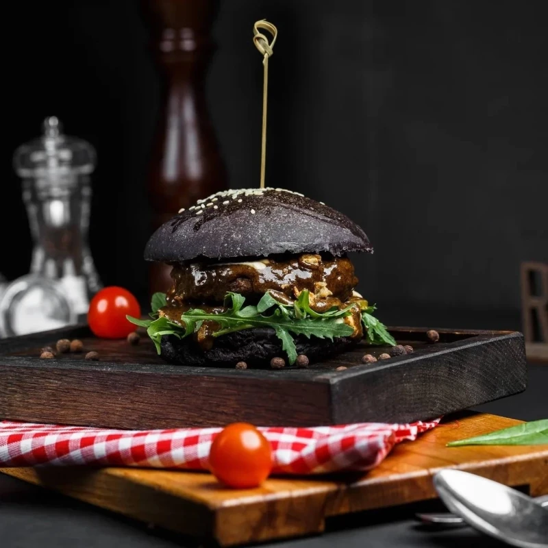 Черная булочка, котлета из говядины, руккола, лук жаренный, огурец, крем сыр, соус черный перец