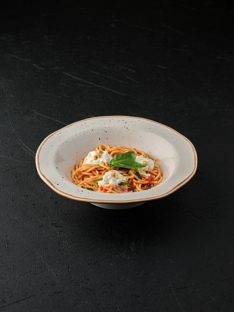 Спагетти, соус томатный, сыр страчателла, кедровый орех, орегано, масло оливковое, базилик, петрушка, орегано, соус Свид Чили