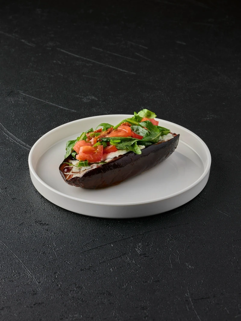 Баклажан, сыр страчателла, свежие томаты, вяленные томаты, руккола, паприка копченная, соус Ким-Чи, соевый соус Сен Сой, соус унаги