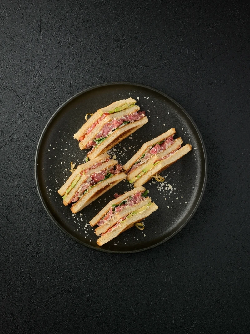 Тунец, сыр пармезан, свежие томаты, авокадо, руккола, сэндвичный хлеб, соус цезарь, соус Дим Сам
